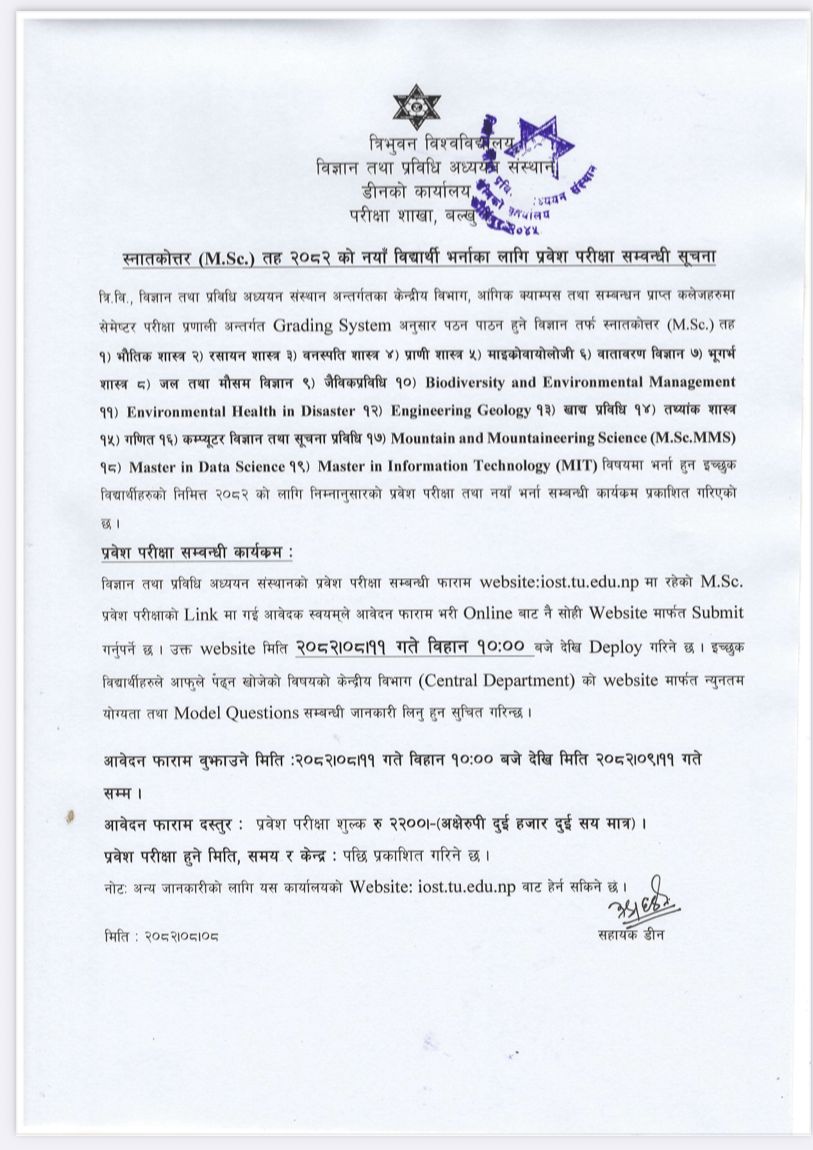 M.Sc. २०८२ सालकाे नयाँ विद्यार्थी भर्नाका लागि प्रवेश परीक्षा सम्बन्धी सूचना