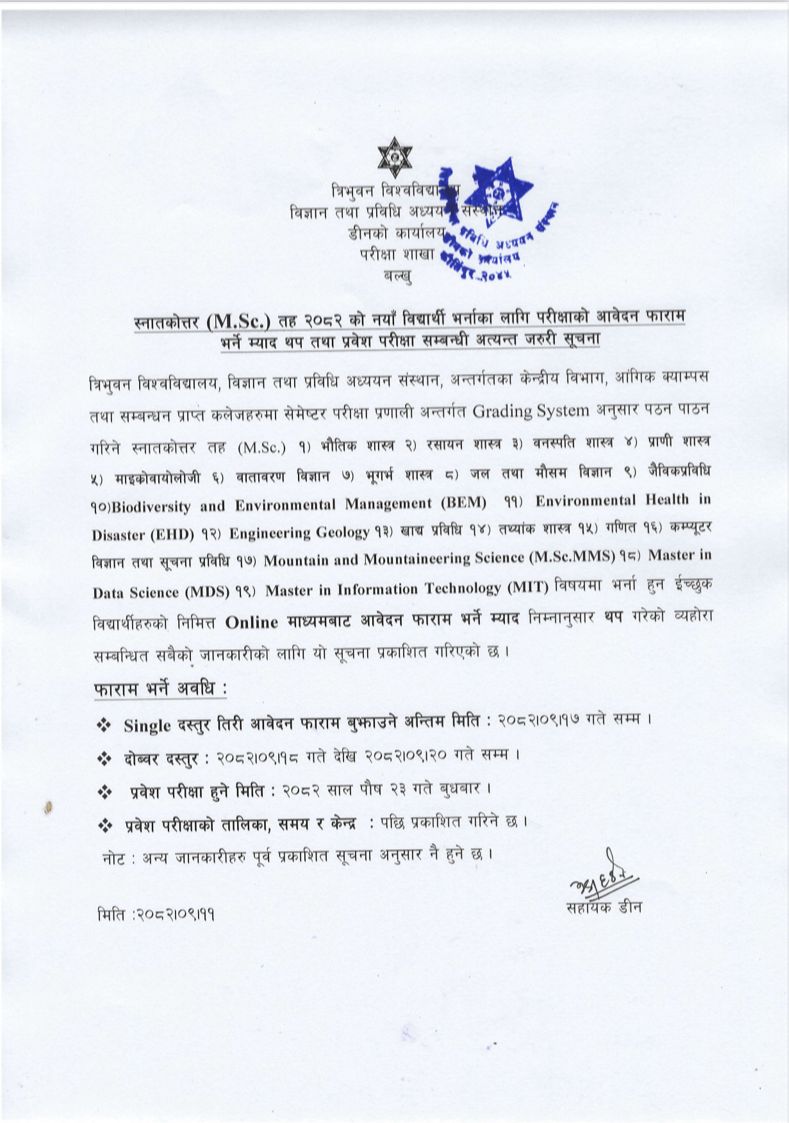 M.Sc. २०८२ सालकाे नयाँ विद्यार्थी भर्नाका लागि परीक्षाकाे अावेदन फारम भर्ने म्याद थप तथा प्रवेश परीक्षा सम्बन्धी सूचना