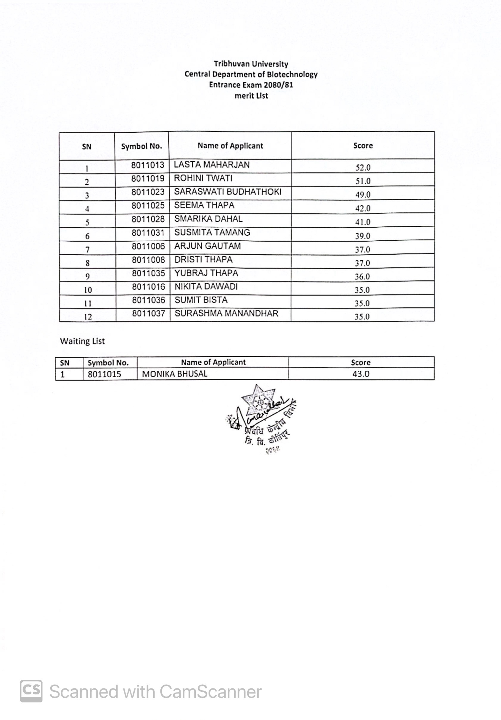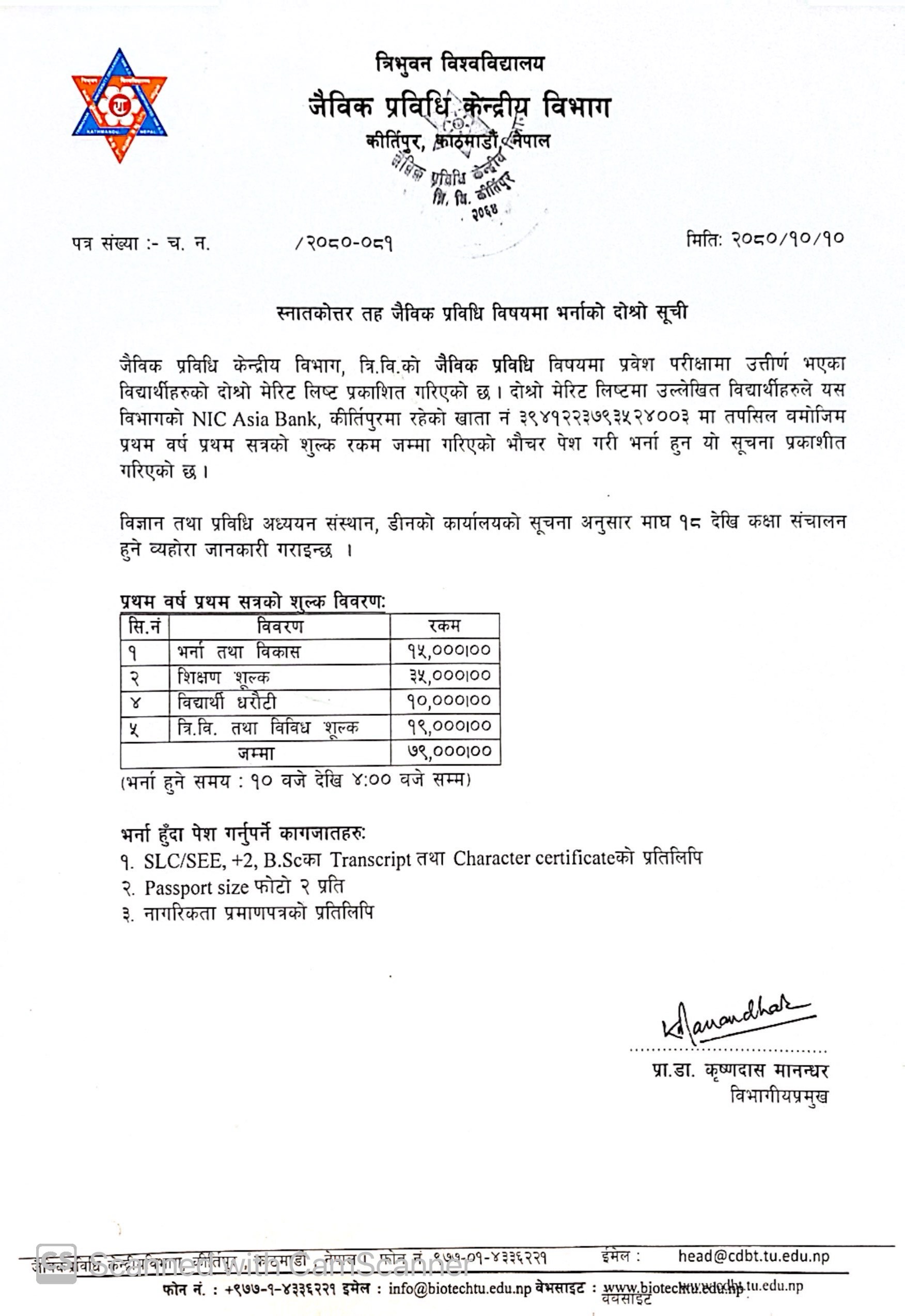 स्नातकोत्तर तह जैविक प्रविधि विषयमा भर्नाको दोश्रो सूची