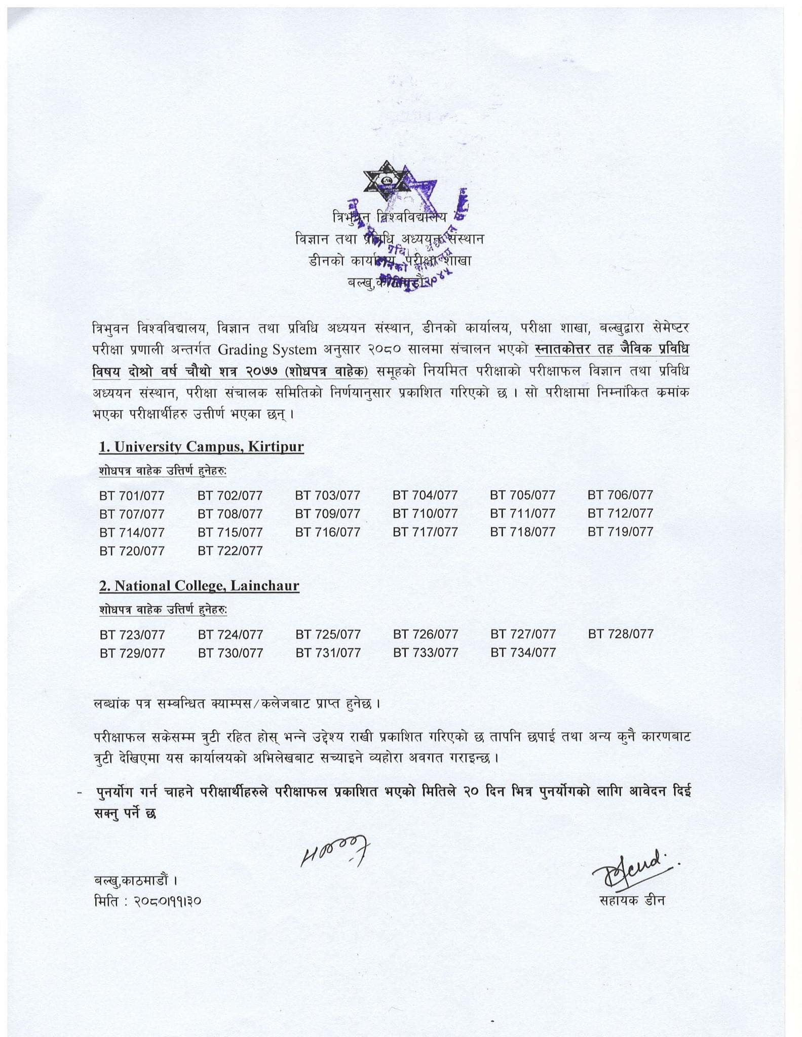 M.Sc. Biotechnology Iv Semester -2077 Exam Result