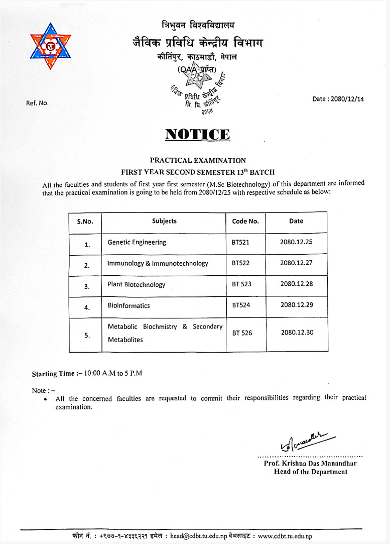 M.Sc. First Year Second Semester 13th Batch Practical Examination 2080 Routine