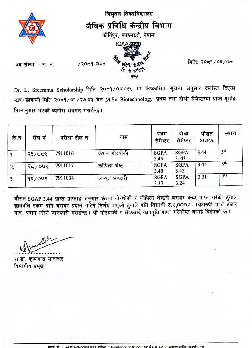 Dr. L Sreerama Scholarship Result Notification for the 13th Batch