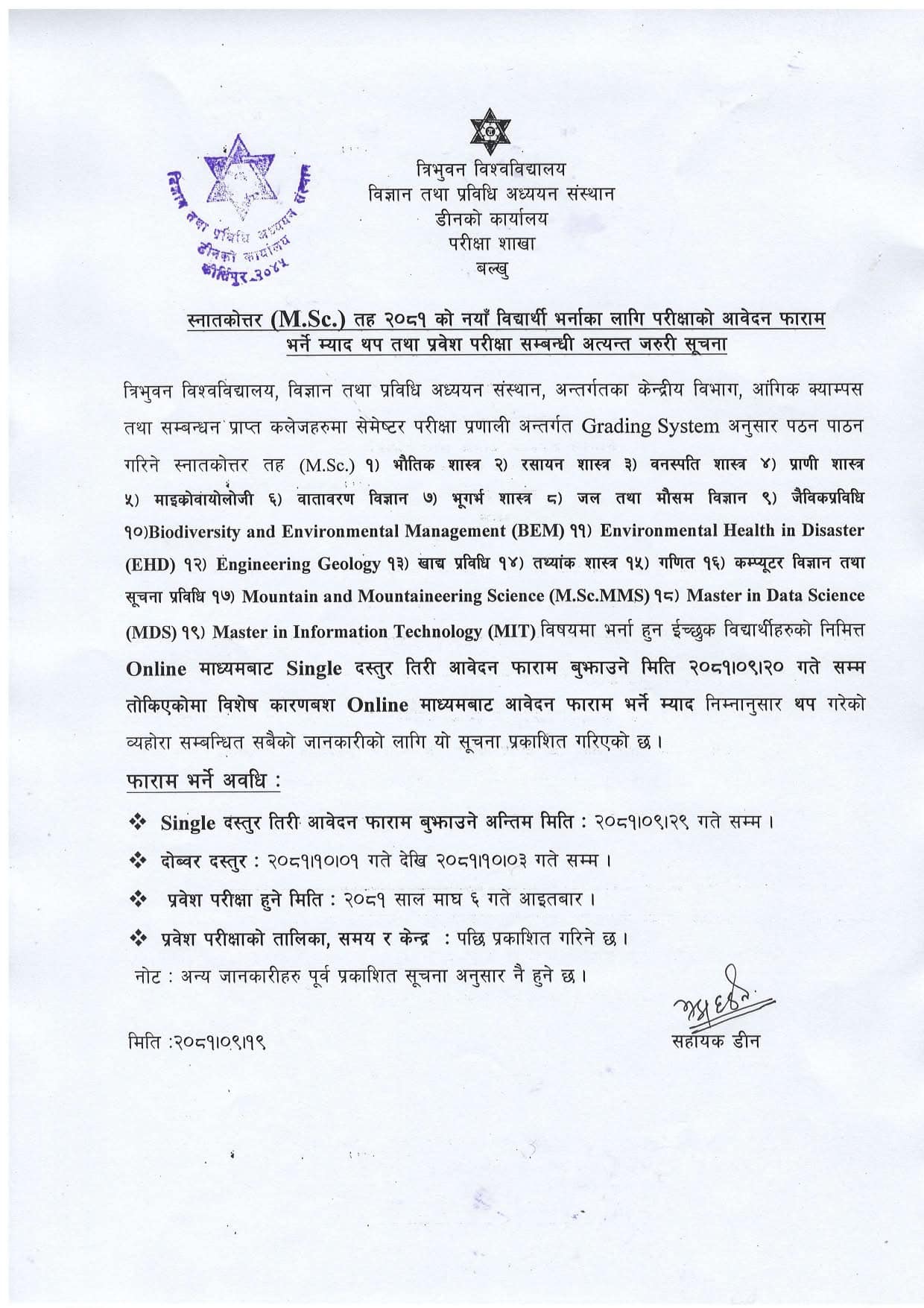 M.Sc. २०८१ काे नयाँ विद्यार्थी भर्नाका लागि परीक्षाकाे अावेदन फारम भर्ने म्याद थप तथा प्रवेश परीक्षा सम्बन्धी सूचना