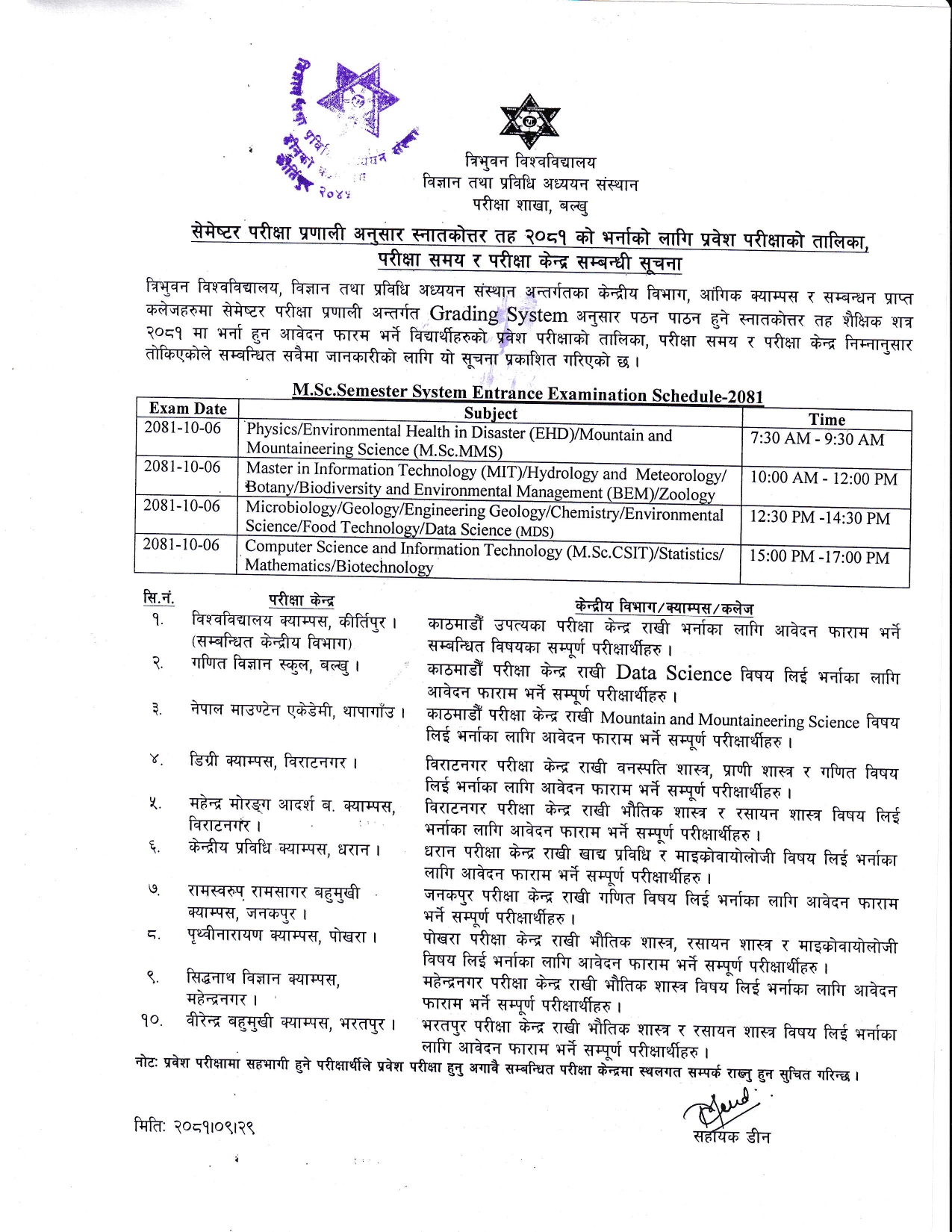 M.Sc Entrance 2081 Exam Schedule, Exam Time and Exam centre Notice
