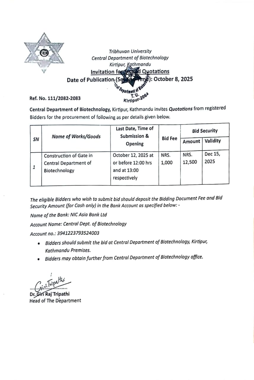 Invitation for Sealed Quotations (Construction of Gate in Central Department of Biotechnology)