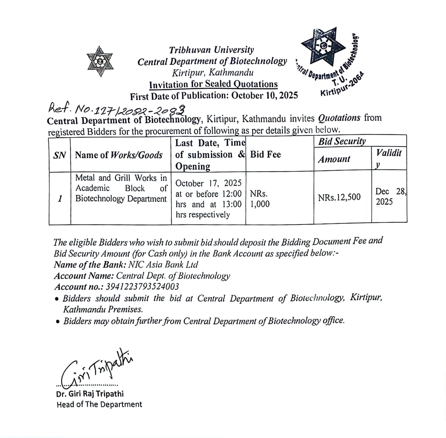 Invitation for Sealed Quotations (Metal and Grill Works in Academic Block)